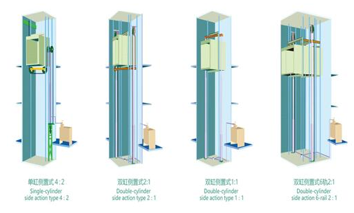 電梯上行時,有液壓泵站提供電梯上行所需動力壓差,有液壓泵站上的閥組控制液壓油流量,實現(xiàn)電梯上行運動。下行時,發(fā)生相反變化實現(xiàn)下行運行。因為液壓電梯不需要在井道上方設立要求和造價高的機房,且液壓電梯轎廂自重及載荷等垂直負荷,均通過液壓缸全部作用于井道地基上,對井道頂部的建筑性能要求低。是很適合小低層別墅安裝的家用電梯的選擇。